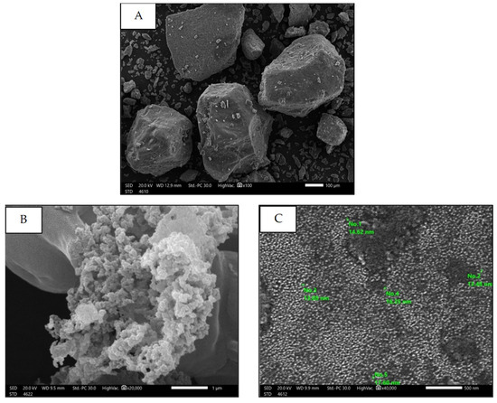SEM was used to assess the particle morphology, size, and shape of free SP and SPNPs, as illustrated in Figure 5A (image magnification: 100×). The free SP particles exhibited an irregular arrangement. In Figure 5B (image magnification: 20,000×), the SPNPs appeared to be spherical, cauliflower-like aggregates with diameters of less than 20 nm, as shown in Figure 5C (image magnification: 40,000×).