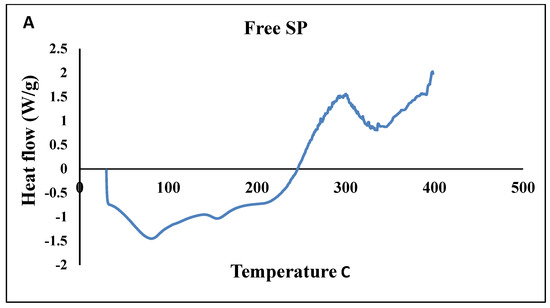 DSC analysis was conducted on free SP particles, polymer (Cs), and SPNPs, as shown in Figure 6 and Table 6. The DSC thermogram of the free SP particles (Figure 6) revealed a broad endothermic peak at 87.08 °C (−1.399 W/g) and a broad exothermic peak at 303.1 °C (1.54 W/g). The polymer (Cs) exhibited a broad endothermic peak at 78.33 °C (−1.078 W/g) and an additional exothermic peak at 328 °C (7.85 W/g). Conversely, SPNPs displayed a slight shift in the broad endothermic peak to 106.53 °C (−1.677), while the exothermic peak shifted to a higher temperature of 398.4 °C (4.13 W/g) (Figure 6 and Table 6).