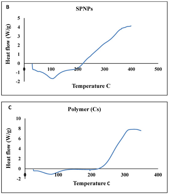 DSC analysis of Free SP particles (A), SPNPs (B), and a polymer (Cs) (C).