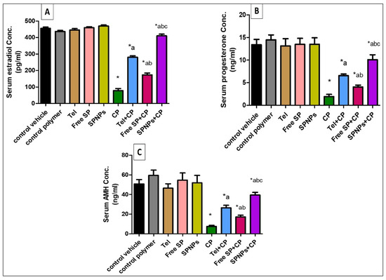 Effects of free SP extract and the nanoformulation on serum levels of estradiol, progesterone, and AMH. (A) Estradiol concentration; (B) progesterone concentration; (C) anti-mullerian hormone concentration. Data are presented as the mean ± SD (n = 6). Each group differed significantly from the others at a p-value ≤ 0.05. * versus the control group, a versus the CP group, b versus the Tel+CP group, and c versus the Free SP+CP group. CP: Cyclophosphamide, SP: Spirulina platenesis extract, SPNPs: Spirulina platenesis extract nanoformulation.