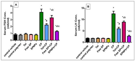 As shown in Figure 9, the cyclophosphamide group showed a remarkable increase (390% and 607.3%) in the levels of FSH and LH relative to the control group. In contrast, pretreatment of rats with Tel showed a considerable decline (45.33% and 52.66%) in serum hormone levels, there was a marked reduction (19.8% and 29.27%) in hormone levels in rats pretreated with free SP extract, and there was a substantial decrease (68.7% and 78.5%) in hormone levels in rats pretreated with SPNPs in comparison with the CP group. Moreover, rats pretreated with SPNPs showed a substantial decline (42.73% and 54.56%) in hormone levels in comparison with the Tel group and (60.97% and 69.6%) in the free SP group (p < 0.05).