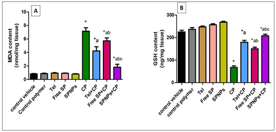 In contrast, the GSH content in the CP group was considerably reduced (70%) in comparison with the control group. However, the depleted GSH content was restored by pre-treatment with Tel, free SP extract, and SPNPs by approximately 165.85%, 123.32%, and 208.38%, respectively, in comparison with the CP group. In addition, rats pretreated with SPNPs showed a marked increase (15.9% and 38%) in GSH content in comparison with the Tel and free SP groups, respectively (p < 0.05).