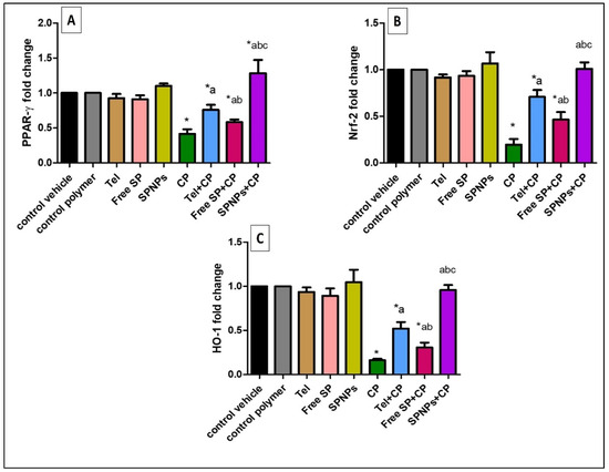 Effects of the free SP extract and the nanoformulation on the PPAR-γ, Nrf-2, and HO-1 signaling pathways in ovarian tissues. (A) PPAR-γ expression; (B) Nrf2 expression; (C) HO-1 expression. Data are presented as mean ± SD (n = 6). Each group differed significantly from the others at a p-value ≤ 0.05. * versus the control group, a versus the CP group, b versus the Tel+CP group, and c versus the Free SP+CP group. CP: Cyclophosphamide, SP: Spirulina platenesis extract, SPNPs: Spirulina platenesis extract nanoformulation.