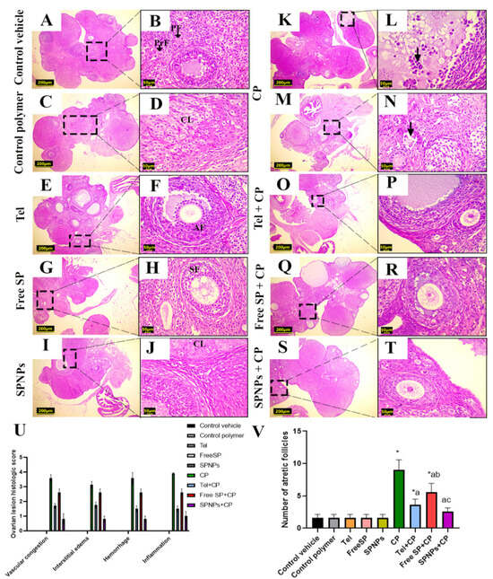 The histopathological analysis of ovarian tissue from the various experimental groups is presented in Figure 12. The groups treated with the control vehicle, control polymer, Tel, free SP extract, and SPNPs exhibited normal ovarian histoarchitecture with different stages of follicular development (Figure 12A–J). In contrast, administration of CP resulted in extensive ovarian damage characterized by marked vascular congestion, hemorrhage, and edema. The CP group showed a lack of follicular stages of development, multiple atretic follicles, and interstitial mononuclear inflammatory infiltrations (Figure 12K–N). The free SP+CP group exhibited similar lesions to those in the CP toxic group but with less severity and a smaller distribution (Figure 12Q,R). The Tel+CP (Figure 12O,P) and SPNPs+CP (Figure 12S,T) groups showed nearly normal histoarchitecture with mild congestion of vessels, hemorrhage, and mononuclear cell infiltration, along with the restoration of follicular developmental stages.
