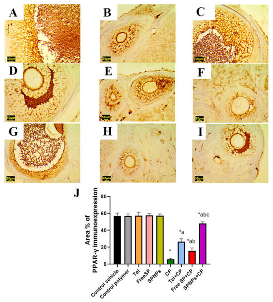 Representative light photomicrographs of rats’ ovarian tissue immunostained with peroxisome-proliferator-activated receptor gamma (PPAR-γ). (A) The control vehicle, (B) control polymer, (C) telmisertan (Tel), (D) free Spirulina platensis extract (Free SP), (E) nanoformulation of Spirulina platensis extract (SPNPs) showed marked PPAR-γ immunoexpression. (F) cyclophosphamide (CP) showed mild PPAR-γ immunoexpression. (G) Tel+CP showed moderate to marked PPAR-γ immunoexpression. (H) Free SP+CP showed moderate PPAR-γ immunoexpression, and (I) SPNPs+CP showed intense PPAR-γ immunoexpression. (J) The area % of PPAR-γ immunoexpression. Scale bar: 50 µm. Data presented as the mean ± SD (n = 6). Each group differed significantly from the others at a p-value ≤ 0.05. * versus the control group, a versus the CP group, b versus the Tel+CP group, and c versus the Free SP+CP group.