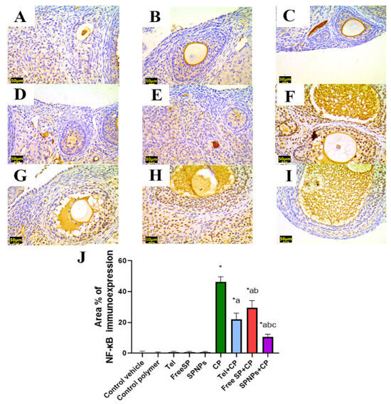 Representative light photomicrographs of rats’ ovarian tissue immunostained with nuclear factor kappa B (NF-κB). (A) The control vehicle, (B) control polymer, (C) telmisertan (Tel), (D) free Spirulina platensis extract (Free SP), and (E) nanoformulation of Spirulina platensis extract (SPNPs) showed negative NF-κB immunoexpression. (F) Cyclophosphamide (CP) showed intense NF-κB immunoexpression. (G) Tel+CP showed mild NF-κB immunoexpression. (H) Free SP+CP showed moderate NF-κB immunoexpression. (I) SPNPs+CP showed weak NF-κB immunoexpression. (J) The area % of NF-κB immunoexpression. Scale bar: 50 µm. Data are presented as the mean ± SD (n = 6). Each group differed significantly from the others at a p-value ≤ 0.05. * versus the control group, a versus the CP group, b versus the Tel+CP group, and c versus the Free SP+CP group.