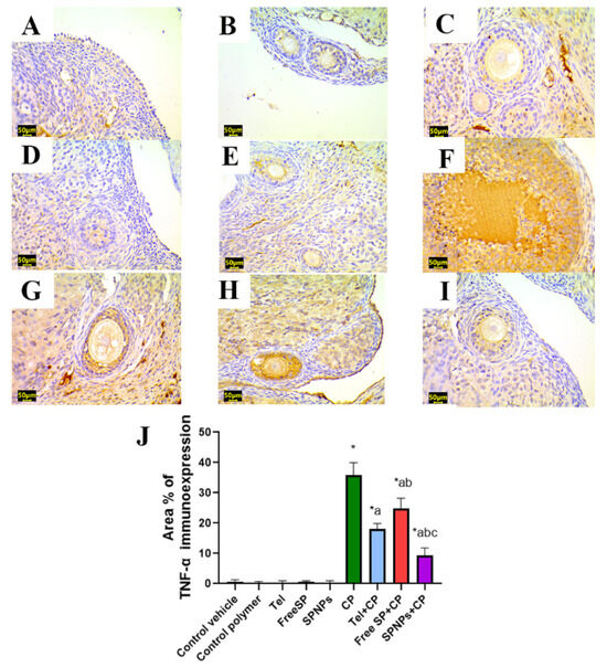 Representative light photomicrographs of rats’ ovarian tissue immunostained with tumor necrosis factor-alpha (TNF-α). (A) The control vehicle, (B) control polymer, (C) telmisertan (Tel), (D) free Spirulina platensis extract (Free SP), and (E) nanoformulation of the Spirulina platensis extract (SPNPs) showed negative TNF-α immunoexpression. (F) Cyclophosphamide (CP) showed intense TNF-α immunoexpression. (G) Tel+CP showed mild TNF-α immunoexpression. (H) Free SP+CP showed moderate TNF-α immunoexpression. (I) SPNPs+CP showed weak TNF-α immunoexpression. (J) The area % of TNF-α immunoexpression. Scale bar: 50 µm. Data are presented as the mean ± SD (n = 6). Each group significantly differed from the others at a p-value ≤ 0.05. * versus the control group, a versus the CP group, b versus the Tel+CP group, and c versus the Free SP+CP group.