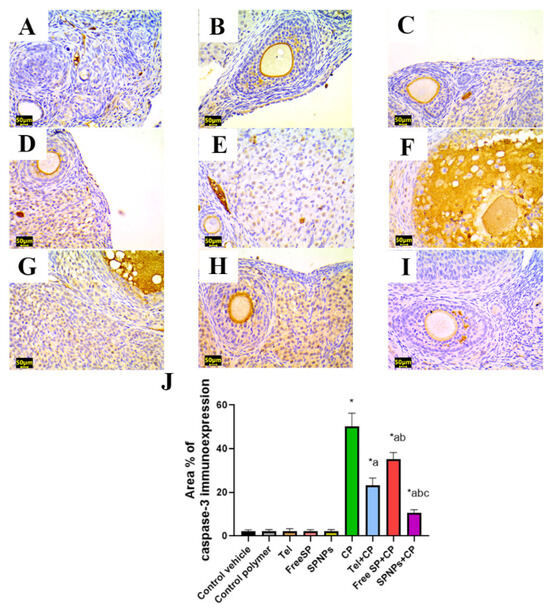Representative light photomicrographs of rats’ ovarian tissue immunostained with caspase-3. (A) The control vehicle, (B) control polymer, (C) telmisertan (Tel), (D) free Spirulina platensis extract (Free SP), and (E) nanoformulation of the Spirulina platensis extract (SPNPs) showed mild caspase-3 immunoexpression. (F) Cyclophosphamide (CP) showed marked caspase-3 immunoexpression. (G) Tel+CP showed mild caspase-3 immunoexpression. (H) Free SP+CP showed moderate caspase-3 immunoexpression. (I) SPNPs+CP showed weak caspase-3 immunoexpression. (J) The area % of caspase-3 immunoexpression. Scale bar: 50 µm. Data are presented as the mean ± SD (n = 6). Each group significantly differed from the others at a p-value ≤ 0.05. *: versus the control group, a versus the CP group, b versus the Tel+CP group, and c versus the Free SP+CP group.