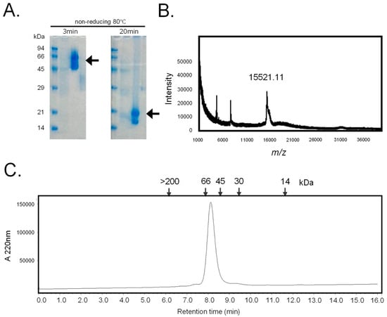Purification of hRTL. (A) The SDS-PAGE pattern obtained after 3 min and 20 min of heating under non-reducing conditions. Numbers on the left indicate the molecular mass (kDa) of marker proteins. Arrows mark the positions of the lectins. (B) Mass spectrometry of hRTL. The MALDI–TOF-MS spectrum showed a molecular mass of 15,521.11 Da. One hundred laser shots measured the signal. (C) The gel permeation chromatography pattern. The purified lectin was applied on a Shodex KW 402.5-4F column connected to an HPLC pump at a flow rate of 0.33 mL/min. Numbers in the upper part indicate the following standard molecular markers: blue dextran (>200 kDa); bovine serum albumin (66 kDa); ovalbumin (45 kDa); carbonic anhydrase (30 kDa); horse myoglobin (14 kDa). The absorbance was detected at 220 nm.
