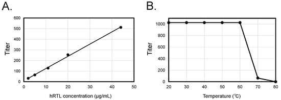 Concentration-dependent enhancement and thermal stability of hRTL hemagglutination activity. Co-relationship between concentrations, hemagglutination (A), and thermotolerance (B) of hRTL.