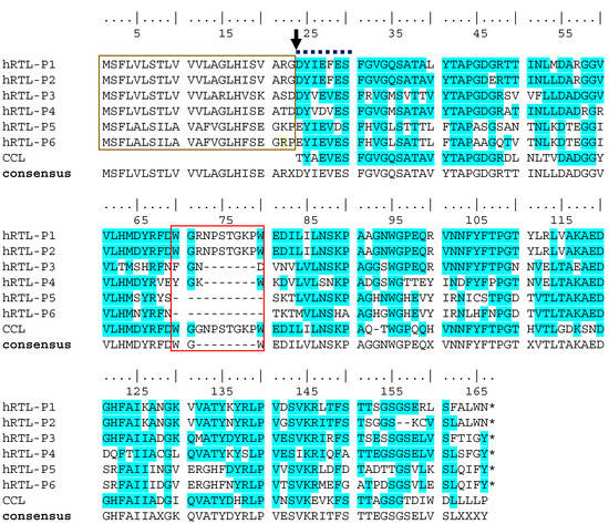 Multiple sequence alignment of the six hRTLs identified in the C. australiensis transcriptome. CCL indicates the lectin previously described in C. calibensis [10]. Two peculiar sequence features of hRTLs are marked with a gold box (the extension located upstream of the N-terminal end determined by Edman degradation) and a red box (the hRTL-P1-, hRTL-P2-, and CCL-specific insertion). An arrow indicates the position of the N-terminal end of the mature protein determined by Edman degradation. A bold dashed line indicates the partial sequence determined by Edman degradation. Conserved amino acids in the multiple sequence alignment are highlighted with a blue background. The numbering of amino acids starts from the N-terminus at the top. Sequence gaps are indicated by dashes (-). X indicates the presence of any amino acid in the sequence consensus.