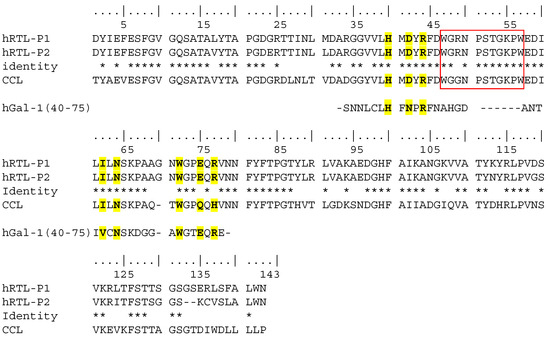 Overall, hRTL-P1, hRTL-P2, and CCL share seven highly conserved amino acids that are important for carbohydrate binding in most galectins, as exemplified by their conservation also in human galectin-1 (Figure 4, yellow highlight). Interestingly, the inserted sequence that distinguishes these lectins from the other hRTLs of Chondrilla (Trp47-Trp57) corresponds to an insertion also compared to human galectin-1 (Figure 4, red box).