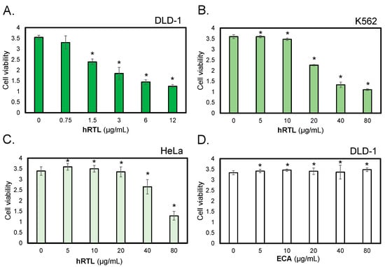 We investigated the cytotoxicity of hRTL against DLD-1, human colorectal carcinoma cells that are known to highly express the TF-antigen [27,28]. In addition, to compare the cellular effect of hRTL, K562 leukemia cells and HeLa cervical cancer cells were selected for the experiments, which express the β-galactoside-containing glycans and moderately express the TF-antigen. Cells (1 × 105/mL) were incubated with various concentrations of hRTL (0.75–80 µg/mL) for 48 h, and cell viability and the proportion of living cells were determined by the WST-8 assay. Cell growth inhibition was observed after adding hRTL at various concentrations, depending on the tested cell line (Figure 7A–C). In particular, the lectin strongly reduced the growth of the colorectal carcinoma DLD-1 cells at low concentrations, leading to a significant effect at 0.75 µg/mL (Figure 7A). On the other hand, another LacNAc-binding lectin, ECA (Erythrina cristagalli lectin), which was used in this case as a negative control, did not affect the DLD-1 cells even at much higher concentrations, up to 80 µg/mL (Figure 7D).