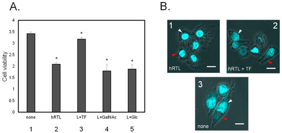 (A) Inhibition of cytotoxic effect of 3 µg/mL hRTL on DLD-1. Without (1) or with (2) hRTL (10 µg/mL). Co-presence of TF-antigen, GalNAc, or Glc (each 20 mM: 3–5). All data are reported as mean ± SE (n = 3). * p < 0.05. (B) The morphological appearance of the cells in presence (1 and 2) or absence (3) of the hRTL lectin, the simultaneous presence of 20 mM TF-antigen and hRTL (2). Cell shrinkage and extensions are indicated by red arrows, whereas nucleus condensation is shown with white arrows. Magnification: 40×. Scale bar: 10 µm.