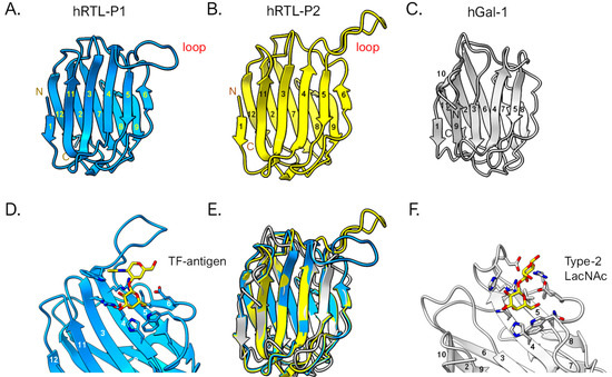 3D structural prediction of hRTLs. hRTL-P1 (A) and hRTL-P2 (B). hGal-1 (human galectin-1) is also shown as a comparison (C). The binding between hRTL-P1 and TF-antigen (D), and hGal-1 and LacNAc (F), respectively. A superimposed view among hRTL-P1, hRTL-P2, and hGal-1 (E). The loops found in the two Chondrilla galectins (upper right blue and yellow in panels (A,B)) were unique characteristics of these hRTLs. Numbers are responding to the order of β-sheets in the polypeptide.