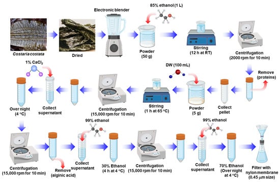 FCC was extracted with a minor modification, based on previous studies, known as the fucoidan extraction method [55]. As detailed in Figure 1, dried C. costata was ground into powder using an electric grinder. Then, 50 g of crushed C. costata was suspended in 1 L of 85% ethanol and stirred at room temperature for 12 h. Subsequently, protein components were removed using centrifugation at 2000 rpm for 10 min. The remaining material was dried again at room temperature. Next, 5 g of powder was suspended in 100 mL of sterilized water at 65 °C for 1 h. After centrifugation at 15,000 rpm for 10 min, the supernatant was collected, added with 1% CaCl2, and incubated at 4 °C overnight to precipitate alginic acid. After centrifugation at 15,000 rpm for 10 min, the supernatant was collected, and 99% ethanol was added to achieve a final ethanol concentration of 30%. Subsequently, the supernatant was stored at 4 °C for 4 h and centrifuged again. Then, 99% ethanol was added to the supernatant to achieve a final concentration of 70% ethanol. Following overnight incubation, fucoidan was obtained after filtering the supernatant through a 0.45 μm nylon membrane.