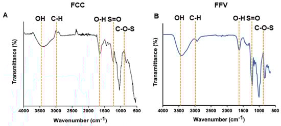 Fourier transform infrared (FT-IR) spectrometer images of FCC. FT-IR data of FCC (A) and Fucoidn from F. vesiculosis (FFV) (B) were shown. Specific chemical bonds are indicated. FCC, fucoidan extracted from Costaria costata.