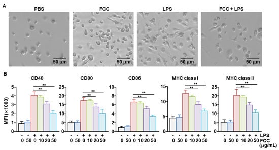 FCC inhibits LPS-induced activation of BMDCs. BMDCs were pretreated with the indicated dose of FCC. One hour after FCC treatment, the cells were stimulated with LPS for 24 h. (A) Morphological changes in BMDCs were examined using a microscope (50 μg/mL of FCC and 20 ng/mL of LPS). (B) Surface activation marker expression in BMDCs was analyzed using flow cytometry. The −/+ on the abscissa axis indicates the presence or absence of LPS, and the numbers below indicate the concentration of FCC. All data are averages or representative from six independent samples (n = 6), ** p < 0.01. BMDCs, bone marrow-derived dendritic cells; FCC, fucoidan extracted from Costaria costata; LPS, lipopolysaccharide.