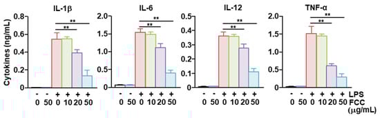 Next, we examined the secretion of pro-inflammatory cytokines by BMDCs. Treatment of BMDCs with FCC alone did not increase the levels of IL-1β, IL-6, IL-12, and TNF-α in the culture medium, indicating that FCC did not induce the activation of BMDCs. Treatment with LPS rapidly increased the concentrations of the examined pro-inflammatory cytokines in the BMDC culture medium. Pretreatment with FCC at different concentrations significantly reduced the LPS-induced secretion of pro-inflammatory cytokines (Figure 4). Therefore, these findings suggested that FCC could suppress the LPS-induced secretion of pro-inflammatory cytokines.