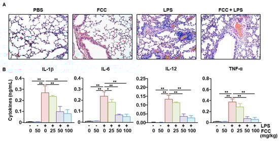 FCC inhibits LPS-induced acute lung inflammation. C57BL/6 mice were orally administered the indicated dose of FCC daily for 3 days. Six hours later, LPS (100 μg/kg) was administered intraperitoneally. (A) H&E staining of the lung after treatment with 50 mg/kg of FCC and 100 μg/kg of LPS. (B) Pro-inflammatory cytokines secreted in BAL fluid were measured using ELISA. The −/+ on the abscissa axis indicates the presence or absence of LPS, and the numbers below indicate the concentration of FCC. Results are expressed as the representative or average of six mice. (n = 6), * p < 0.05, ** p < 0.01. BAL, bronchoalveolar lavage; ELISA, enzyme-linked immunosorbent assay; FCC, fucoidan extracted from Costaria costata; H&E, hematoxylin, and eosin; LPS, lipopolysaccharide; IL, interleukin; PBS, phosphate-buffered saline; and TNF-α, tumor necrosis factor-α.