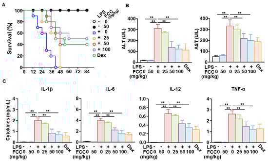 Next, we examined whether FCC could attenuate LPS-induced sepsis. Mice were orally administered 25, 50, and 100 mg/kg FCC daily for 3 days, with LPS (10 mg/kg) administered intraperitoneally 24 h after the last FCC administration. All mice died within 42 h of LPS administration (Figure 6A). In the group treated with 50 mg/kg FCC, 40% of the mice survived, and in the group treated with 100 mg/kg FCC, 50% of the mice survived (Figure 6A). Serum concentrations of alanine transaminase (ALT) and aspartate transaminase (AST), hepatocyte enzymes that indicate increased liver toxicity induced by LPS, were significantly reduced in FCC-treated mice (Figure 6B). Moreover, pretreatment with FCC reduced the LPS-induced increase in pro-inflammatory cytokines in mice (Figure 6C). The anti-inflammatory effect of FCC against LPS was comparable to that of the positive control, dexamethasone (Dex). Accordingly, oral administration of FCC could suppress LPS-induced sepsis.