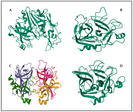 Structures of representative proteases: (A) pepsin, (B) trypsin, (C) α-chymotrypsin and (D) pancreatic elastase. The enzyme structures were obtained from the Research Collaboratory for Structural Bioinformatics Protein Data Bank—RCSB PDB (RCSB.org)—using PDB ID 1AM5 for pepsin from Atlantic cod [44], PDB ID 1HJ8 for trypsin from Atlantic salmon [45], PDB ID 4CHA for bovine α-chymotrypsin [46] and PDB ID 1ELT for elastase from North Atlantic salmon [47]. The different colors in subfigure (C) represent the different chains in α-chymotrypsin.