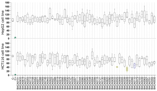 Figure 1. Cell viability after 48 h of exposure to cyanobacterial exudate extracts at 25 µg/mL in the HepG2 and HCT116 cell lines. Strains are taxonomically sorted. Statistical differences vs. the solvent control are indicated in color: green: p < 0.001; yellow: p < 0.01; blue: p < 0.05, Kruskal–Wallis test followed by Dunn’s posthoc test.