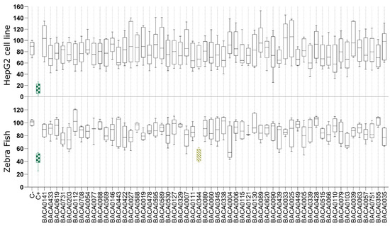 In the cytotoxicity assays (Figure 1), none of the extracts significantly reduced the viability of the HepG2 cells. On the contrary, exposure to extracts of three strains resulted in low cellular viability on the HCT116 cell line, namely: Tolypotrichaceae BACA0428 (30.45%), Aphanizomenonaceae BACA0025 (40.84%), and Microchaetaceae BACA0110 (46.61%).