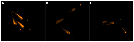 Figure 3. Reduction in neutral lipids in zebrafish larvae, stained with Nile red (orange), by the exudate extract. (A) zebrafish larvae from the negative control group (water); (B) zebrafish larvae exposed to resveratrol at 50 µM (positive control); (C) zebrafish larvae exposed to Dulcicalothrix sp. BACA0344 exudate extract.