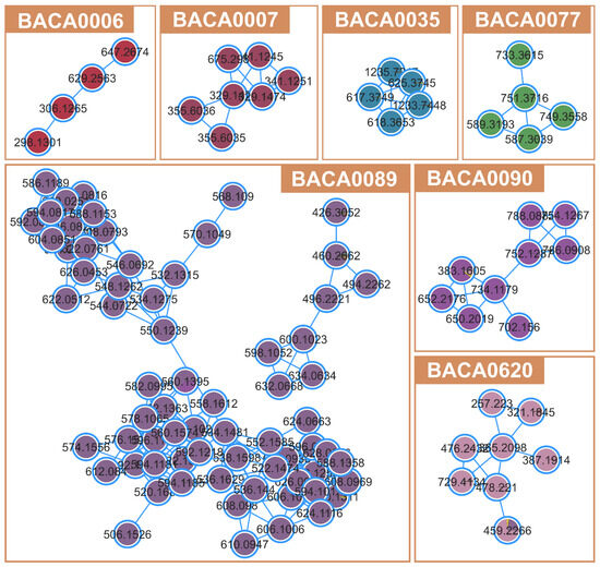 Figure 5. Clusters from the FBMN for cytotoxic activity against HCT116 cell lines. Significantly correlated nodes are highlighted with size and color (Aphanizomenonaceae BACA0025 in purple; Microchaetaceae BACA0110 in pink; Tolypotrichaceae BACA0428 in dark yellow).