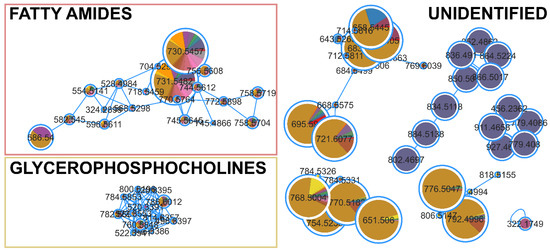 The FBMN analysis for cytotoxicity against the HCT116 cell line identified 51 compounds (Table S2) with significant correlation (p < 0.05, correlation > 0.5). The identified clusters consisted of fatty amides, glycerophosphocholines, and many unidentified clusters of compounds (Figure 5), mainly produced by Tolypotrichaceae BACA0428 or Aphanizomenonaceae BACA0025. Microchaetaceae BACA0110 did not have correlations in any cluster, but some single nodes with low correlation and no putative identifications.