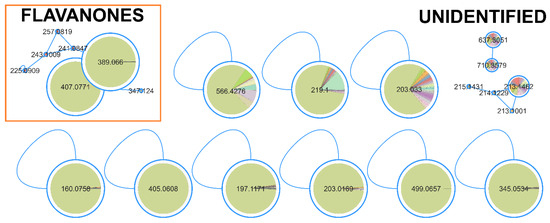For lipid reduction in the zebrafish larvae, only the strain Dulcicalothrix sp. BACA0344 demonstrated activity. The FBMN analysis identified 18 compounds (Figure 6; Table S2) correlated with lipid-reducing activity, and 14 of them with a very high correlation (>0.9). Although many compounds are represented by unclassified single nodes in GNPS or MS2Query, two compounds related to the bioactivity were present in a cluster and identified as flavanones.