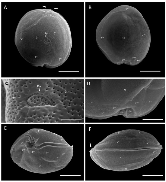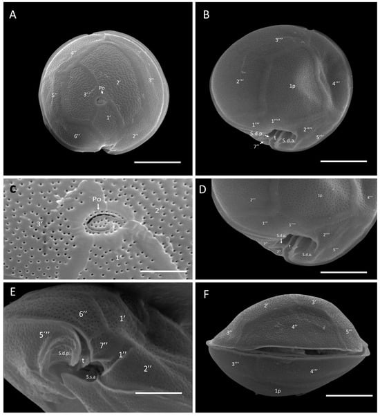 Scanning electron micrographs of Gambierdiscus cf. caribaeus (GbSa-7). (A) Apical view, (B) Antapical view, (C) Po plate, (D) Sulcal area in antapical view, (E) Sulcal area in ventral view, and (F) Dorsal view. Scale bars: (A,B) 50 µm, (C) 10 µm, (D) 20 µm, and (E,F) 30 µm.