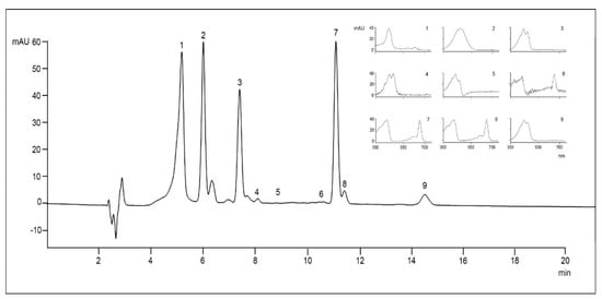 To investigate the composition and concentration of pigments, samples were collected between days 24–25 of culture during the early exponential growth phase. As a result of this, nine pigments were identified in Gambierdiscus strains (Figure 5 and Figure 6).