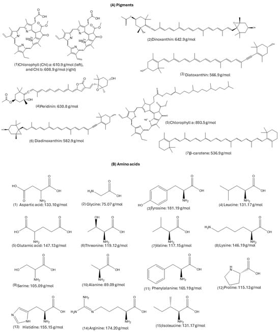 Principal pigments and amino acids detected in five strains of Gambierdiscus cf. caribaeus and G. cf. carpenteri in this study. (A) Pigments: (1) chlorophyll c1-c2, (2) Dinoxanthin, (3) diatoxanthin, (4) peridinin, (5) Chlorophyll a, (6) diadinoxanthin, and (7) β, β-carotene. (B) Amino acids: (1) aspartic acid, (2) glycine, (3) tyrosine, (4) leucine, (5) glutamic acid, (6) threonine, (7) valine, (8) lysine, (9) serine, (10) alanine, (11) phenylalanine, (12) proline, (13) histidine, (14) arginine, and (15) isoleucine.