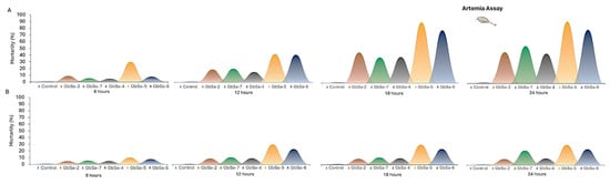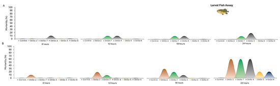 Artemia salina lethality bioassay. (A) Brine shrimp exposed to CTX-like activity of Gambierdiscus cf. caribaeus (GbSa-2 and GbSa-7) and Gambierdiscus cf. carpenteri (GbSa-4, GbSa-5, and GbSa-6). (B) Brine shrimp exposed to MTX-like activity of Gambierdiscus cf. caribaeus (GbSa-2 and GbSa-7) and Gambierdiscus cf. carpenteri (GbSa-4, GbSa-5, and GbSa-6).