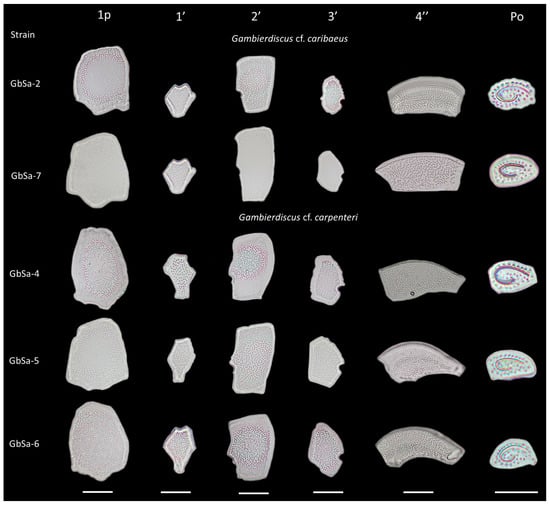 Light microscopy of typical morphology plate 1p, 1′, 2′, 3′, 4″, Po plate under present in Gambierdiscus cf. caribaeus (GbSa-2, GbSa-7) and Gambierdiscus cf. carpenteri (GbSa-4, GbSa-5, GbSa-6). Scale bar: 20 µm.