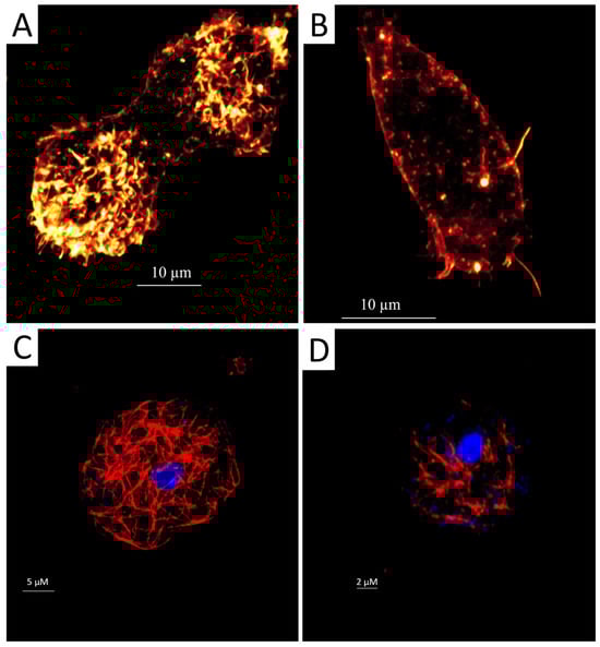 Evaluation of the effect of IC90 of staurosporine on the actin and tubulin cytoskeleton of Acanthamoeba castellanii trophozoites for 24 h. The phalloidin-TRITC dye stains the polymerised actin cytoskeleton showing the normal organization of the networks with an orange fluorescence in the negative control cells (A); scale bar represents 10 µm. Treated cells emitted a lower orange fluorescence, and trophozoites showed disorganized and degraded acanthopodium (B); scale bar represents 10 µm. Tubulin antibodies bind to microtubules and stain them in control cells showing an intense red fluorescence and demonstrating a normal conformation (C); scale bar represents 5 µm. However, trophozoites incubated with staurosporine show disorganization or destruction of the tubulin microtubules (D); scale bar represents 2 µm. Mounting with DAPI solution for DNA staining shows a blue fluorescence (C,D). All images (63×) were obtained using an inverted confocal light microscope Leica DMI 4000 B (Deerfield, IL, USA).