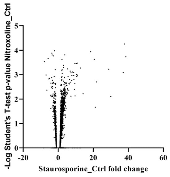 Volcano graph expressing a logarithmic Student’s t-test p-value as a function of staurosporine protein control fold change.