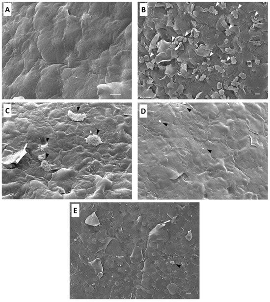 Scanning electron microscopy analysis of the effect of Acanthamoeba castellanii trophozoites and/or staurosporine on mouse corneas during 3 h. The co-incubation of mouse corneas with staurosporine at IC90 shows no evidence of damage or cell disorganization (A); Group 1, scale bar represents 10 µm. Mouse corneas co-cultured with trophozoites of Acanthamoeba castellanii (B); scale bar represents 10 µm; Group 2 presented de-epithelization of the corneal epithelium by the amoebic infection penetrating between the junctions of the epithelial cells (white arrows). Corneas co-incubated with trophozoites of Acanthamoeba castellanii pretreated with staurosporine 30 min prior (C); scale bar represents 10 µm; Group 3 showed that fewer trophozoites adhered to the corneal epithelium (black arrows), which did not migrate toward the inner layers of the corneal epithelium; therefore, the damage was very limited. In the corneas with simultaneous infection and treatment with staurosporine (D)—Group 4, scale bar represents 10 µm—the cellular debris of Acanthamoeba castellanii trophozoites was observed (black arrows), and the corneal epithelium showed no cell damage or signs of amoebic invasion. Corneas co-cultured with trophozoites and treated with staurosporine 30 min after infection (E); scale bar represents 10 µm; Group 5 showed that no-healthy cells adhered to the corneal surface (black arrow), and the corneal epithelium showed signs of early stages of amoebic infection. Images were obtained using a JEOL-JSM 7100F scanning electron microscope (JEOL Ltd., Tokyo, Japan).