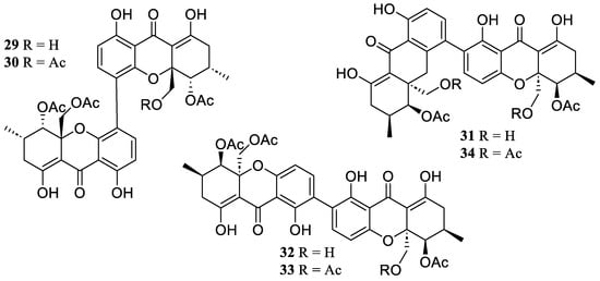 Six known xanthone dimeric analogs were obtained from the ascidian Styela plicata-derived fungus Diaporthe sp. SYSU-MS 4722, which were 12-deacetylphomoxanthone A (29), phomoxanthones A (30) and B (31), dicerandrols B (32) and C (33), and deacetylphomoxanthone B (34) (Figure 3). They indicated anti-inflammatory activity with IC50 values ranging from 6.3 to 8.0 µM, which suppressed toward NO generation in LPS-induced RAW 264.7 [].