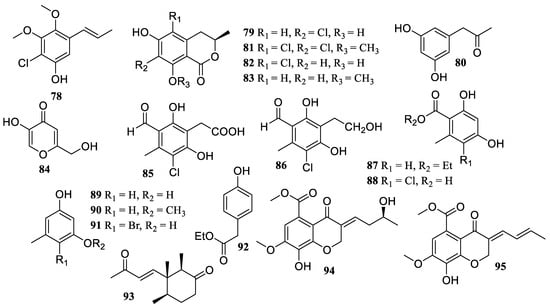 One new propenylphenol derivate, chlomophenol A (78), together with six known compounds, 7-chloro-3,4-dihydro-6,8-dihydroxy-3-methylisocoumarine (79), α-acetylorcinol (80), (S)-5,7-dichloro-6-methoxy-2-methyl-2,3-dihydrobenzofuran-4-carboxylic acid (81), 5-chloro-6-hydroxymellein (82), 3-methyl-6-hydroxy-8-methoxy-3,4-dihydroisocoumarin (83), and kojic acid (84) (Figure 7), were obtained from a mangrove-endophytic fungus Amorosia sp. SCSIO 41026. They showed inhibitory effects on the overproduction of NO and pro-inflammatory cytokines in LPS-induced RAW 264.7 macrophages without cytotoxicity at a concentration of 10 µM [].