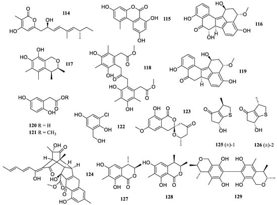 One new α-pyrone derivatives, diaporpyrone A (114), was isolated from cultures of the mangrove endophytic fungus Diaporthe sp. QYM 12 (Figure 9). It inhibited the production of NO in LPS-induced RAW 264.7 cells with an IC50 value of 12.5 µM []. The chemical examination of the Antarctic fungi Pleosporales sp. SF-7343 revealed one known fungal metabolite, alternariol (115). It inhibited the secretion of interleukin-8 and -6 in TNF-α/interferon-γ-treated HaCaT cells at concentrations of 2.5 to 10.0 µM [].
