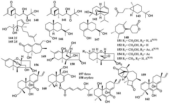 Chemical structures of sesquiterpenoids and diterpene (140–162).