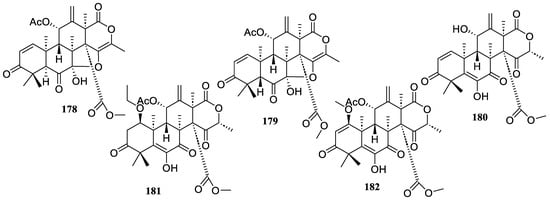 Chemical structures of meroterpenoids (178–182).