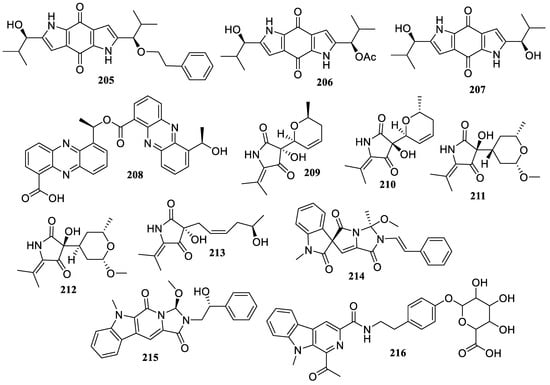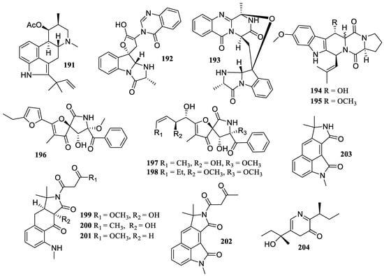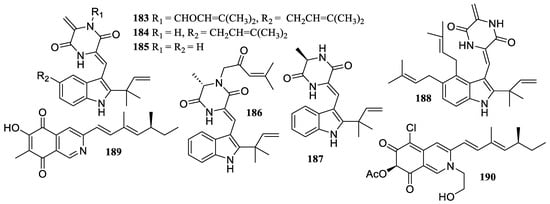 Two new compounds, aspechinulins B (183) and C (184), together with four known compounds, isoechinulins A (185) and B (186), neoechinulin B (187), and cryptoechinuline G (188) (Figure 14), were isolated from the sediment-derived fungus Aspergillus sp. FS 445. They illustrated inhibitory effects against NO production with IC50 values ranging from 20 to 90 µM [].