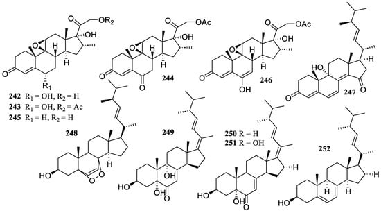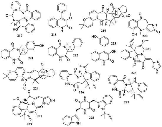 The chemical investigation of marine-derived fungus Aspergillus terreus GZU-31-1 yielded five new congeners, aspermeroterpenes D–H (178–182) (Figure 13). These compounds prevented RAW 264.7 cells from producing NO in response to LPS. They demonstrated notable anti-inflammatory activity with IC50 values of 6.7 ± 0.8, 29.6 ± 3.9, 22.2 ± 0.9, 25.9 ± 3.1, and 26.5 ± 1.0 µM, respectively [].