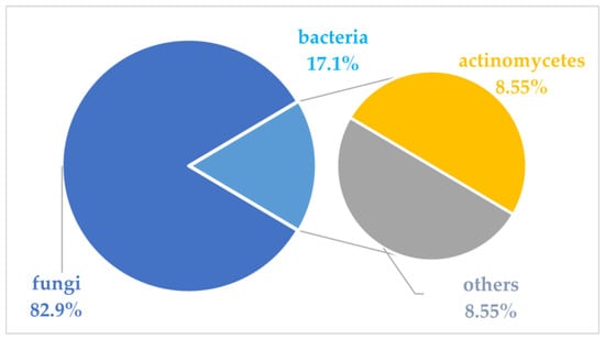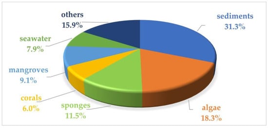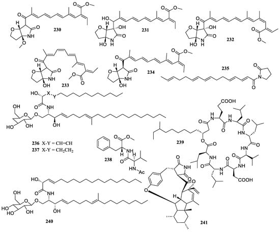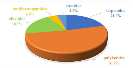 In the previous literature, Xu et al. reviewed 133 marine fungi-derived anti-inflammatory compounds in the period from 2000 to 2018, including alkaloids, terpenoids, polyketides, peptides, and others []. Souza Cássio, R.M. et al. summarized 41 marine alkaloids with anti-inflammatory activity and gave future perspectives for their investigation and bioprospecting []. Since marine microorganisms have been continuously evidenced as rich sources of anti-inflammatory compounds in recent years, this review summarizes the sources, chemical structures, and pharmacological properties of anti-inflammatory natural products recently reported from marine microorganisms during 2021–2023. A total of 252 compounds with anti-inflammatory activity were obtained from marine microorganisms during 2021–2023, including 129 new ones (51.2%). They were mainly isolated from marine fungi (82.9%), along with marine bacteria or marine actinomycetes (17.1%). The structural types of these reviewed compounds are mainly divided into polyketides (51.2%), terpenoids (21.0%), alkaloids (18.7%), amides or peptides (4.8%) and steroids (4.3%), while 8.5% of them are halogenated compounds.