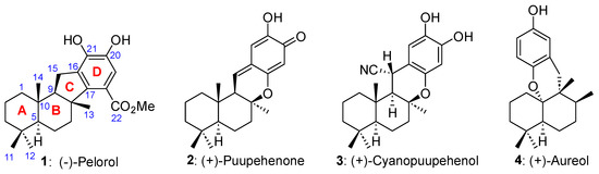 - Rosales Martínez, A.; Enríquez, L.; Jaraíz, M.; Pozo Morales, L.; Rodríguez-García, I.; Díaz Ojeda, E. A Concise Route for the Synthesis of Tetracyclic Meroterpenoids: (±)-Aureol Preparation and Mechanistic Interpretation. Mar. Drugs 2020, 18, 441. [Google Scholar] [CrossRef]