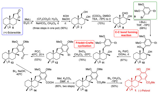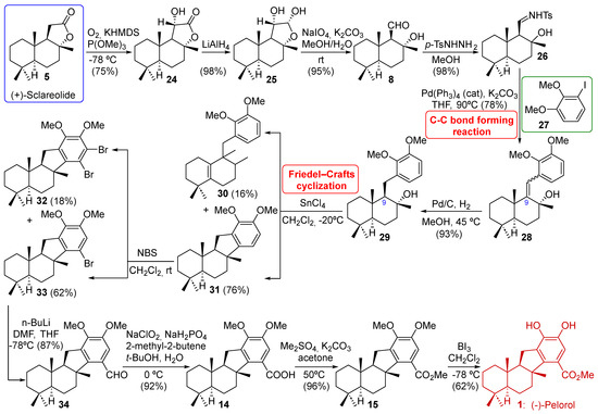 The next logical step should be cyclization to form ring C. However, to avoid the inversion of configuration at C-9 during the process, the double bond in 28 had to be hydrogenated prior to the cyclization. The reverse procedure (cyclization and subsequent hydrogenation) led to products with the opposite configuration at the C-9 position, and was used by Bisai and coworkers for the synthesis of 9-epi-pelorol [29]. The hydrogenation of the intermediates 28 gave 29 at a 93% yield. The Friedel–Crafts cyclization of 29 in the presence of SnCl4 allowed the formation of the desired C ring in the tetracyclic compound 31 in 76% yield, although a rearranged minor compound 30 was also formed with a 16% yield. The bromination of 31 with NBS gave monobrominated 33 as the major product (62% yield), together with the dibromoderivative 32 as a minor one (18% yield). The formylation of the bromo compound 33 was achieved with DMF in the presence of n-BuLi, which led to the formation of aldehyde 34 at an 87% yield. The Pinnick oxidation [29] of 34 yielded carboxylic acid 14 at a 92% yield, which was then methylated to form the ester 15 in 96% yield. Finally, the selective demethylation of 15, using the conditions previously reported by Andersen in the synthesis of 1 [19], resulted in the marine (−)-pelorol (1) at a 62% yield. The formal synthesis of 1 was completed in 12 steps (9% overall yield) from available starting material (+)-sclareolide (5).